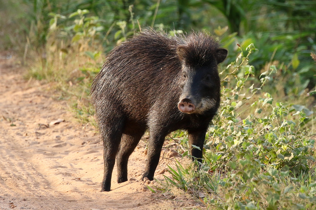 Literally just outside the lodge’s fence we diverted off the unpaved road to look into a culvert under it and there was our first jaguar sighting of the trip! This stunning male was happily rolling around in the culvert sheltering from the heat.