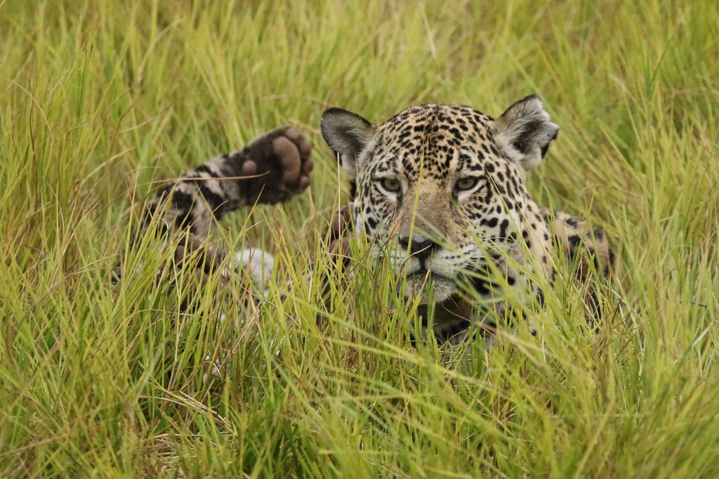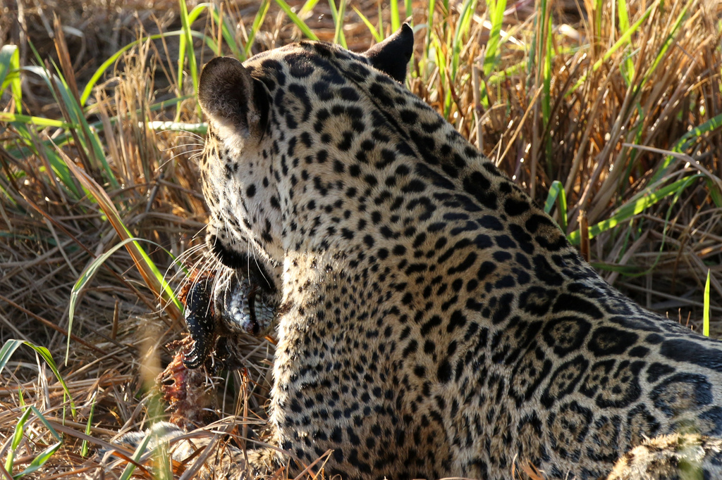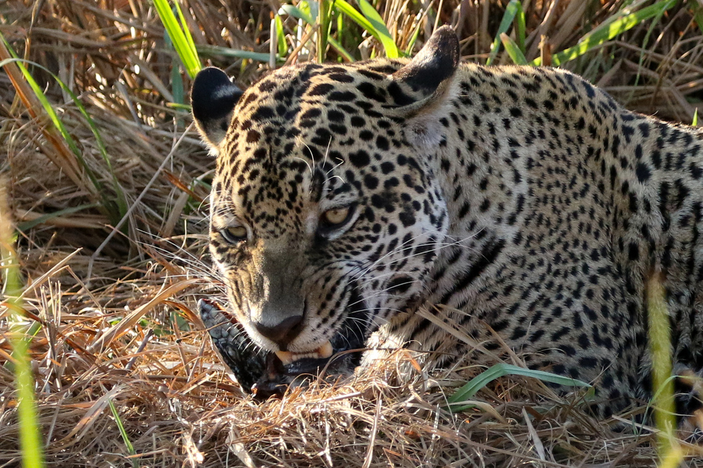 Our last full day was another magical day full of great wildlife. The day started with our closest and best lit sighting of a giant anteater. We could see it hoovering up the termites! Our last jaguar sighting was another ‘on our own’ sighting where we happened upon a female with a tegu kill. She carried it across the track and munched on it. We watched her enjoying her snack and then move to rest in the grasses next to a pond. When another vehicle arrived she got up and melted away into the trees.