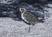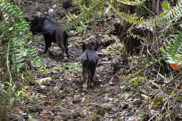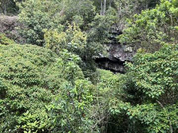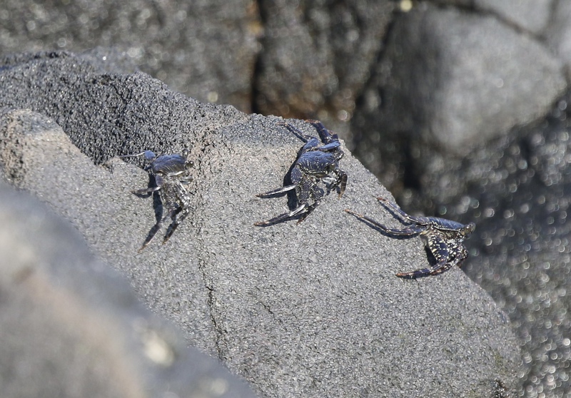 Next we drove to Manuka Natural Area Reserve to do the nature trail. This two-mile loop trail was described as gently gaining 400 feet in elevation with a recommendation to allow 2 to 3 hours. This was anything but a gentle walk. The broken up lava was quite difficult to walk on and the gain in elevation did not feel gentle when walking in the heat of the day! We could hear birds but they were difficult to spot and impossible to photograph. At one point we heard a deep grunt from the bushes but didn’t see what had made the sound. A little later in the walk we saw what we first thought was ground fowl, but quickly noticed they had four legs! They were piglets, around ten of them scattered into the bushes and we just caught a few wagging tails on camera. We’re sure the grunt we heard earlier in our walk was a wild pig.