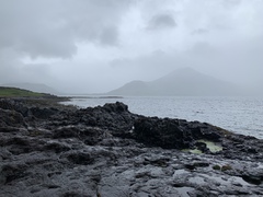 Then it was about 40 minutes to Kellan on Loch Na Keal, and an introduction to the narrow single track Mull roads. We unpacked, settled in and watched the rain drift in across the loch and mountains until dark.