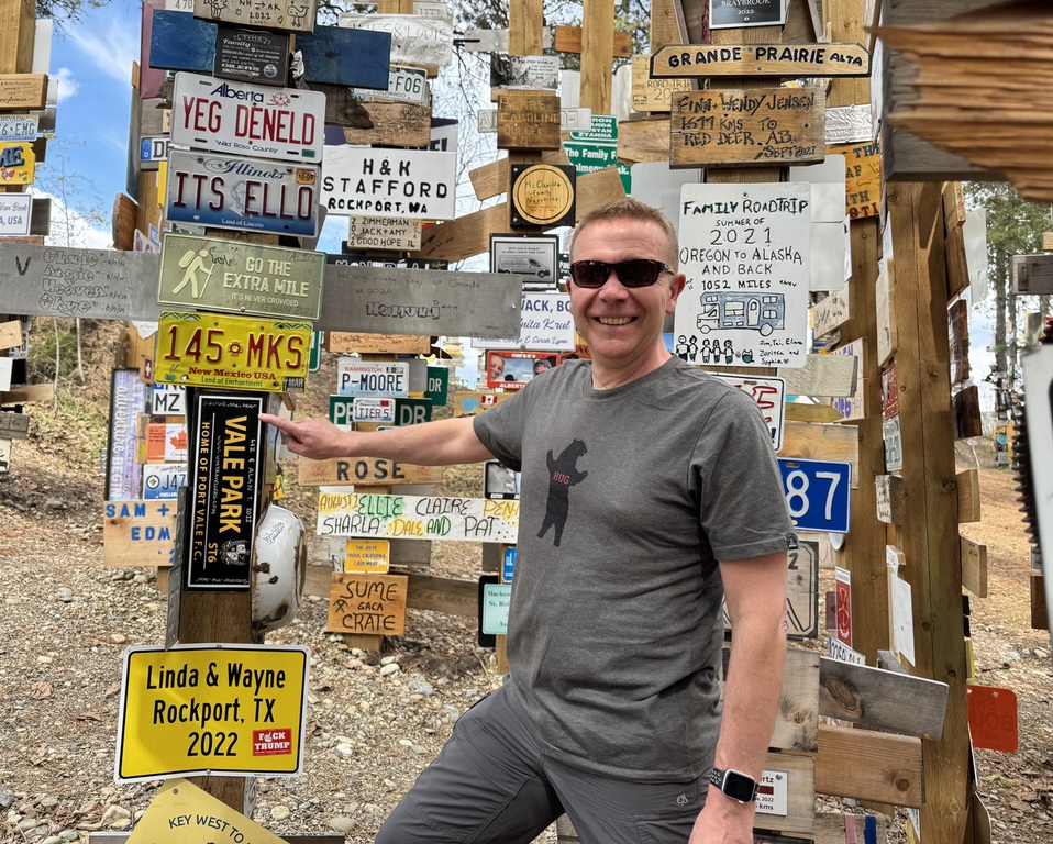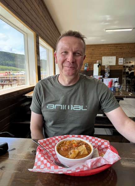 Then to Watson Lake and our night at the Nicer Motel. Since our last visit, they have bought the cabins we stayed at in 2022, but I turned down the offer of a transfer, due to the construction work going on at the site… “good decision” said the clerk! We revisited our signs at the Signpost Forest (including re-finding of the one we put up in 2014!) and then had a Chinese dinner at Nugget Restaurant. Pretty good relatively given the very limited options in Watson Lake, and much better than the experience at Andrea’s last time.