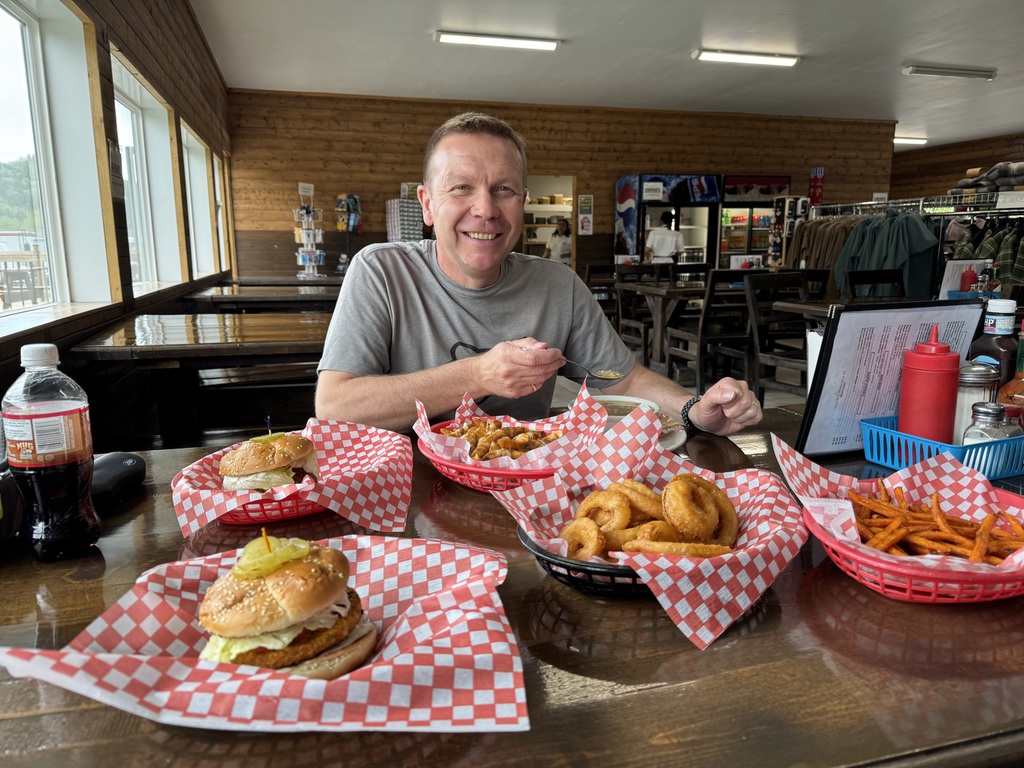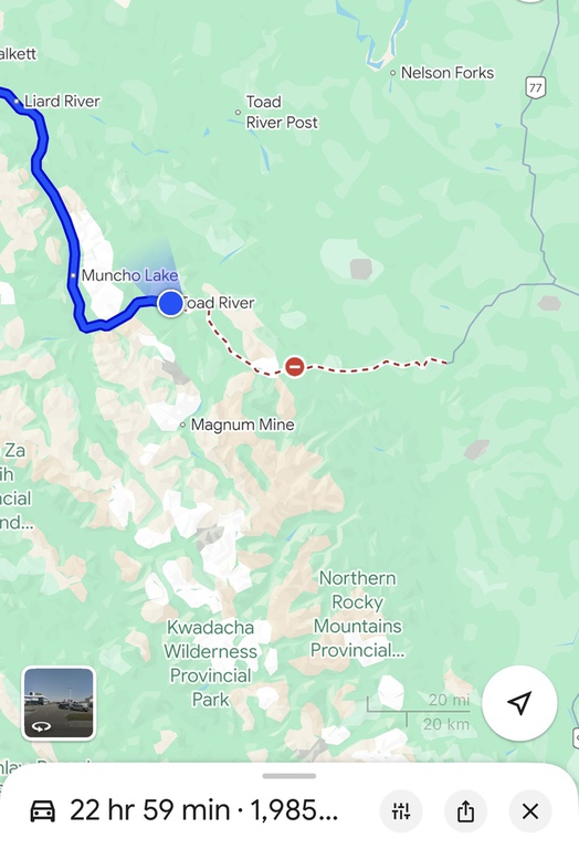 Toad River was busy, with frustrated travellers including truck drivers, waiting for news, but we still managed to get fuel and another tasty lunch…Toad River lodge had a captive audience and nice extra income stream. A few people were getting a bit angsty and saying they were just going through the closure, until it was pointed out by the truck drivers that a C$1500 and maybe arrest might not be such a good idea! Some were looking at the hyper long alternative going back to Watson Lake and south on the Cassiar.