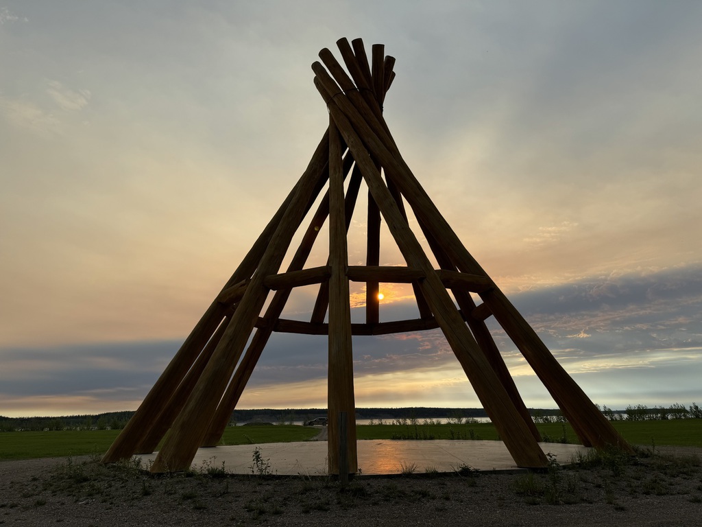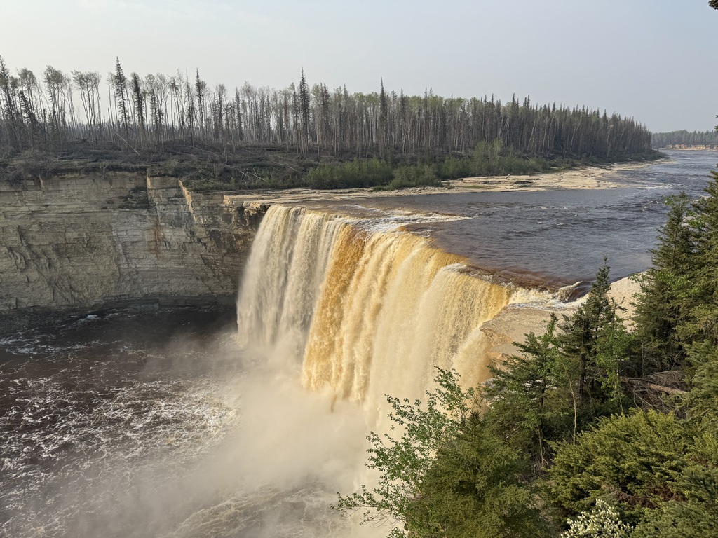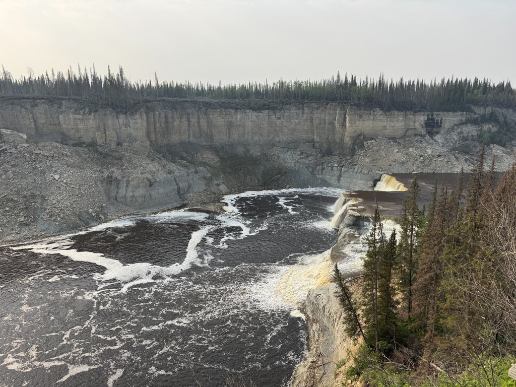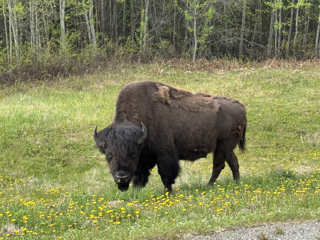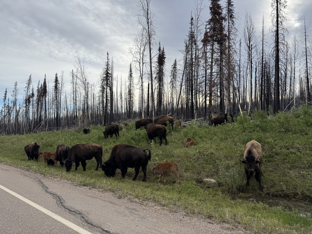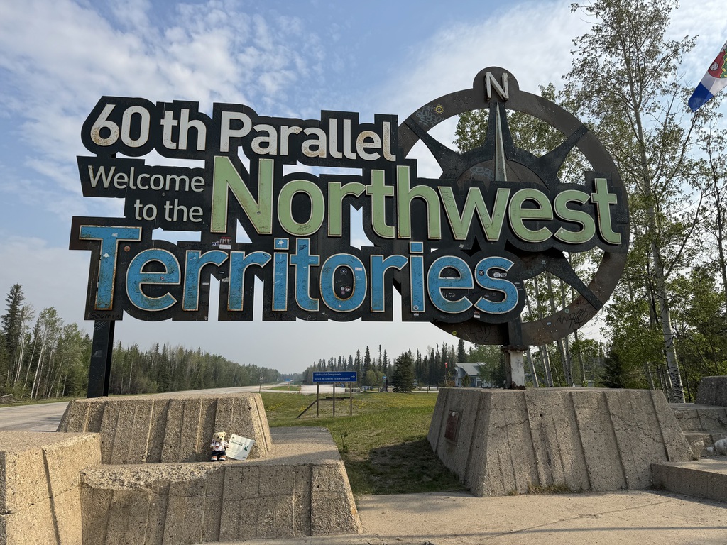 We did ok with early wildlife spotting, two back bears, a fox, and some of the Fort Providence bison herd. Plus, we saw much of the devastation of the 2023 wildfires around Enterprise. We stopped briefly at both Louise and Alexandra Falls, before the NWT visitors center at the Alberta border. We had a chat with the resident staff and got our 60 degree parallel certificates.