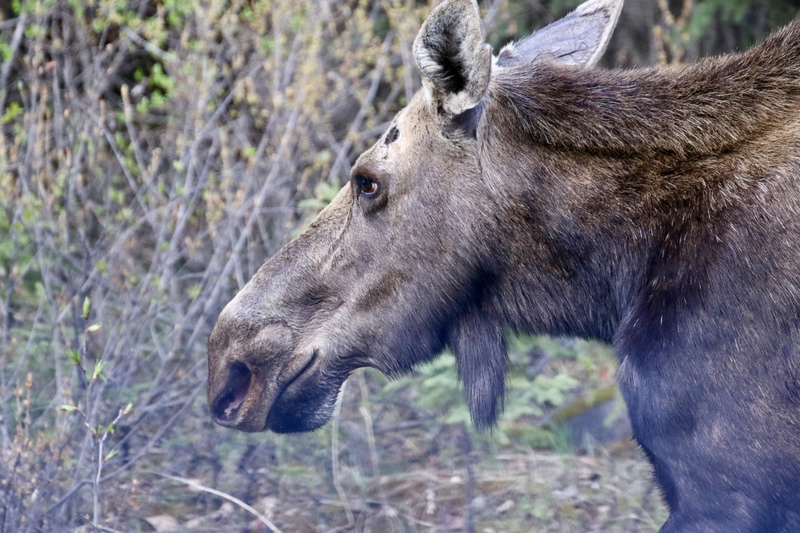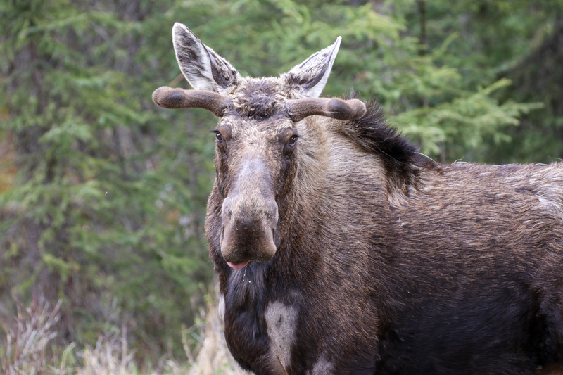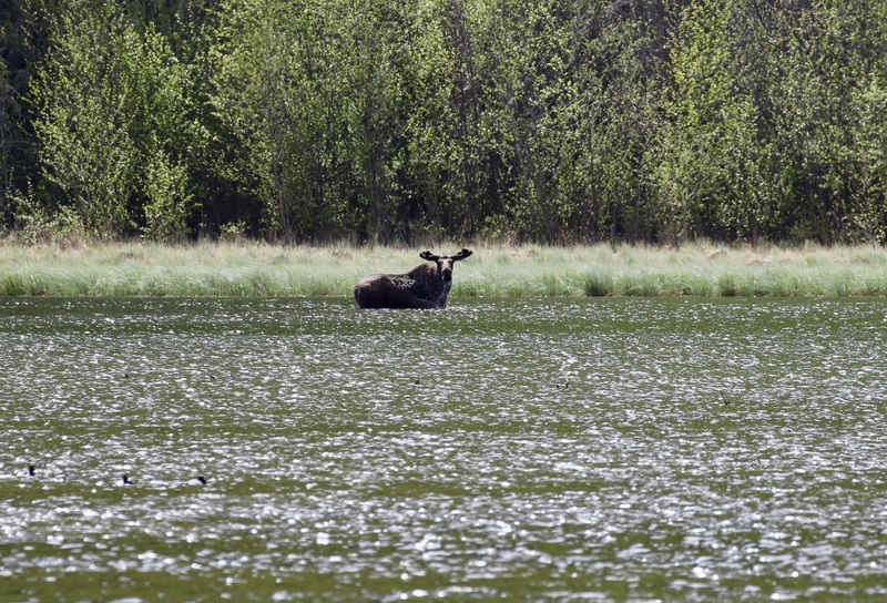We again drove the South Klondike hwy to Fraser and noticed less ice on the lakes and many many more Cruise passengers on trips! Near to Log Cabin and the Yukon suspension bridge we spotted the next to last (Black) Bear of the trip, number 35, and the usual Mountain Goats near the Yukon sign and Conrad. We decided to drive the Tagish Road again after a look around Carcross for a short break, and spotted another shy but big Bull Moose.