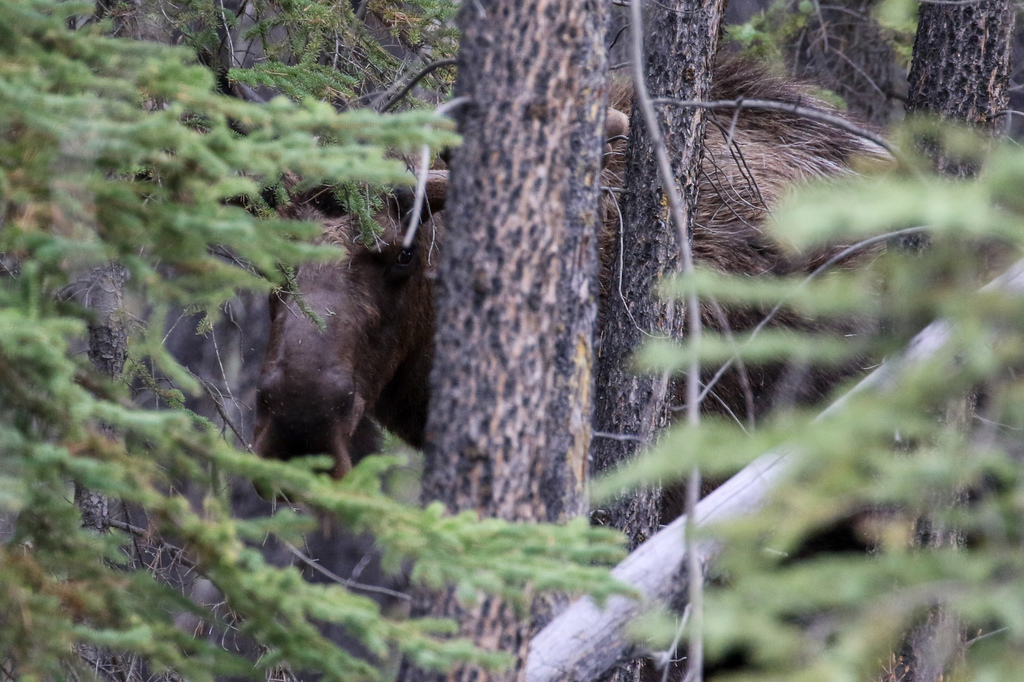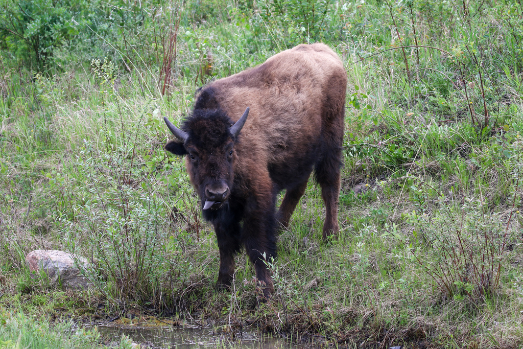 This was a touring day, but we still had a dawn departure to head eastwards (towards Fort Nelson). The moose were having an early morning dip, and no sooner had we set out, than we met a lot of Elk enjoying the fruits of the local farmers efforts, and moose and caribou between Toad River and Tetsa River lodge, (good cinnamon buns apparently) where we turned around. Then back west the way we had come, stopping for a hike at Baba Canyon and then further west towards Coal River, where we finally saw today’s Black Bear contingent along with many more Bison with new born and young calves.