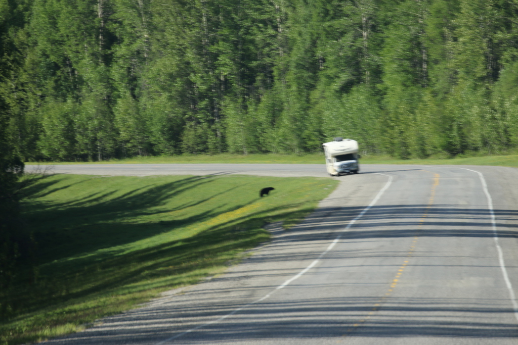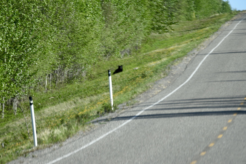 Well, if the MacKenzie was dull in bits of NWT, the route through Alberta south was no better. Km after km of dead straight, flat road, with pineous monotonous alongside, until it changed into km after km of farmland around High Level. Although we did spot on Alberta black bear, and the swarm of black bees or wasps that buzzed around me as I filled the car at Meander River was interesting, but fortunately they were more fixated on RAH!