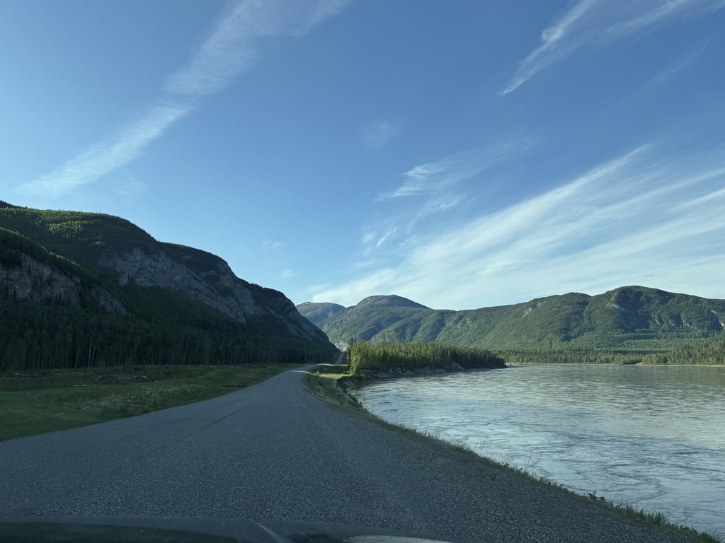 We had a short drive today, so decided to go exploring up the Robert Campbell as a dawn adventure. We drove as far as Tuchitua (tungsten mining) and a bit up the gravel section from there towards Ross River. It was still a bit sticky and slick in places from the rain yesterday.