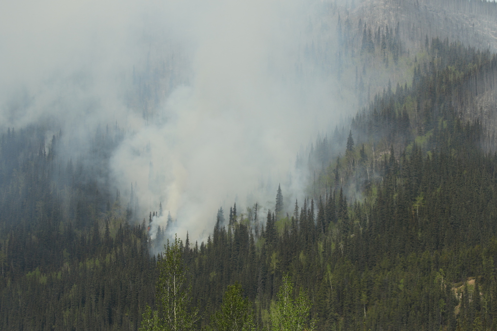 As we approached the hiking spot, we noticed lots of smoke, and as we got nearer, saw that the mountainside north of the river was on fire! We had noticed a lack of traffic heading west and would find out why a bit later! There were a number of helicopters (from Toad River as it turned out) and we decided that the hike was not a good idea in the circumstances.